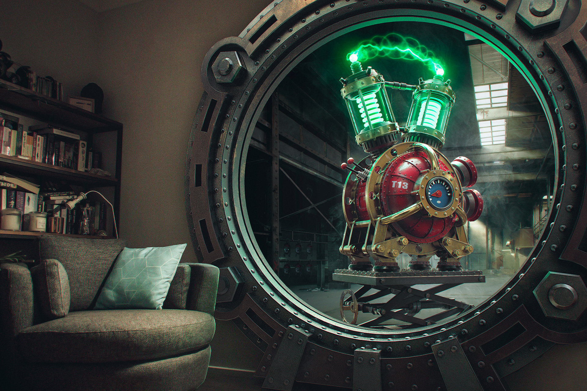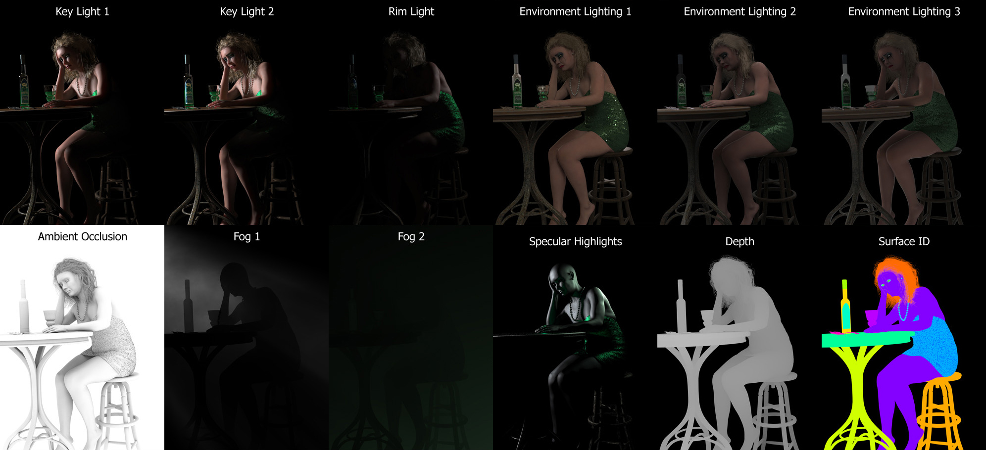 • Compositing layers rendered far various work in post, including individual lights, fog, depth, AO, world space normals, and reflections.
